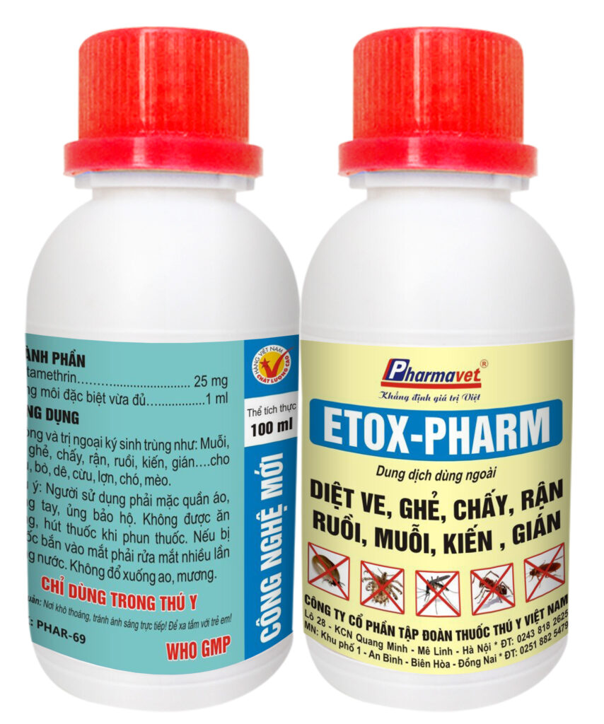 – Etox-pharm, 1 ml/2 lít nước, phun đều lên bề mặt chuồng nuôi, xung quanh chuồng gà.