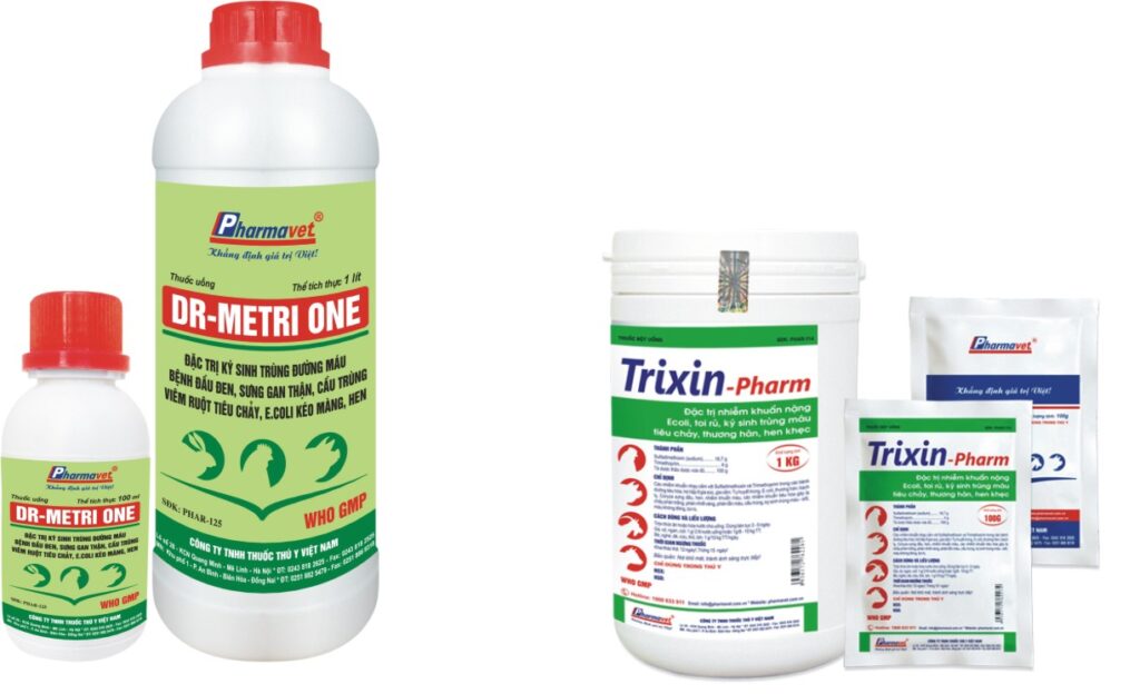– Cho uống: Dr-Metri one (1 ml/2 lít nước) hoặc Trixin-pharm (1 g/lít nước uống).