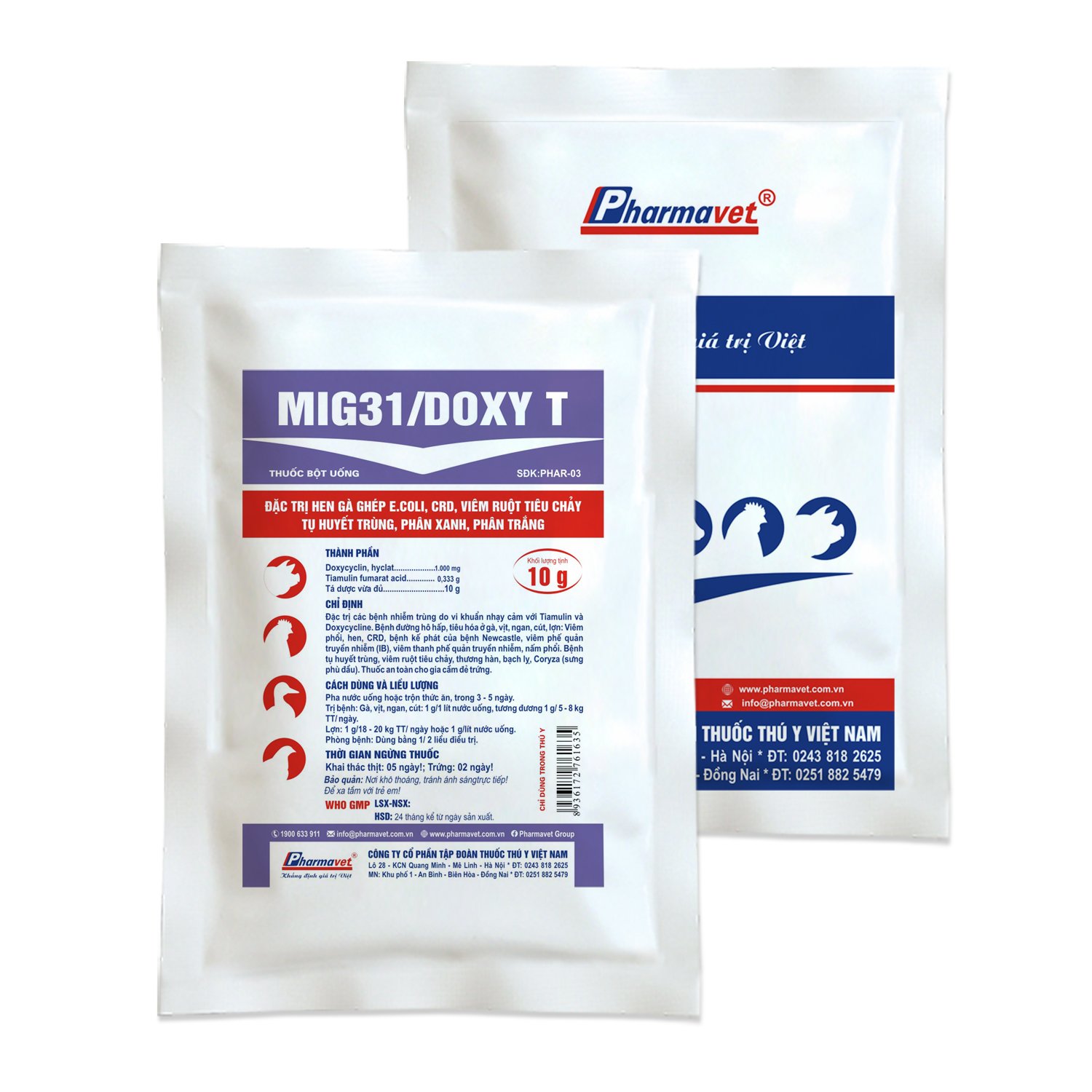 * Chicken, duck, muscovy duck, quail: 1 g/1 liter of drinking water, equivalent to 1 g/5 – 8 kg weight/day.