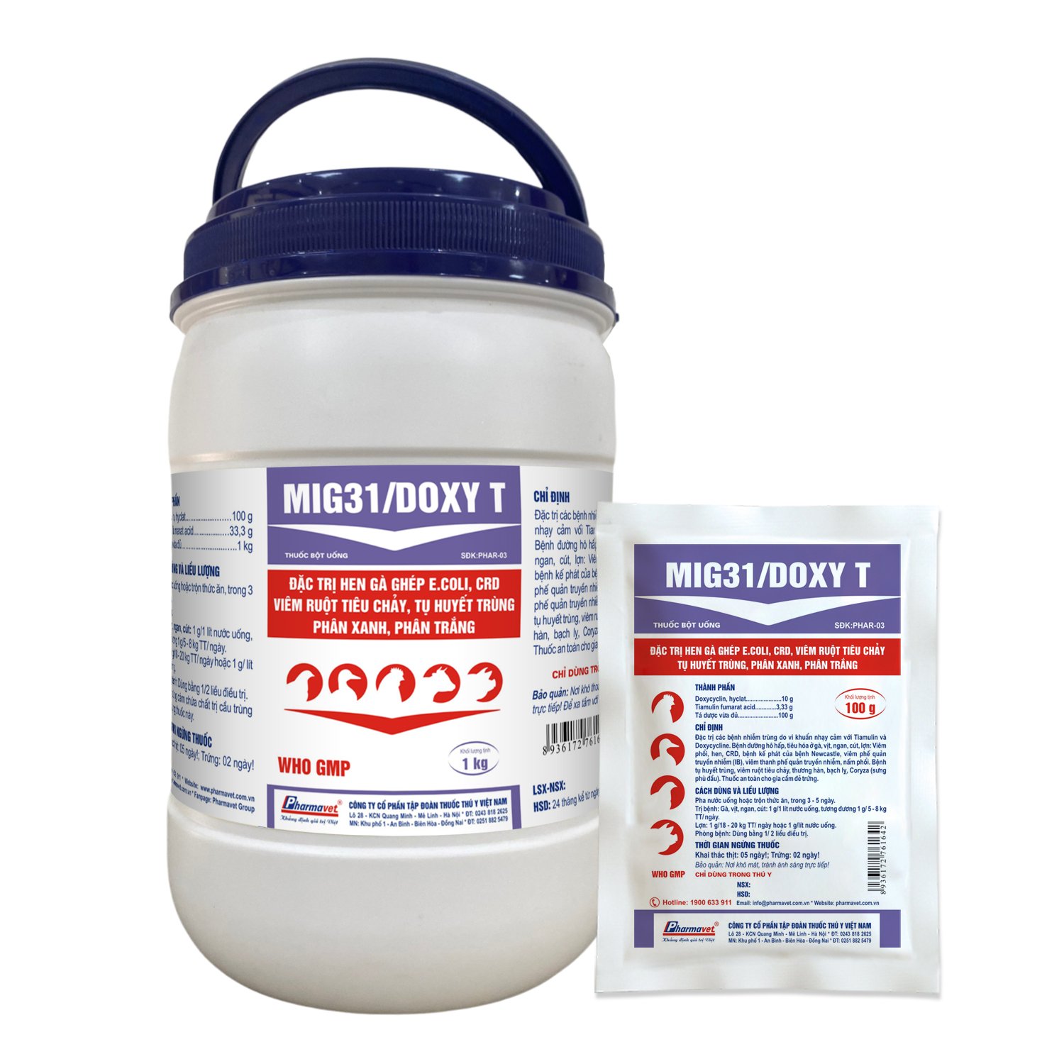 Specific remedy of respiratory and digestive diseases in chickens, ducks, muscovy ducks, quails, pigs: Pneumonia, asthma, CRD, secondary disease of Newcastle disease, infectious bronchitis (IB), aspergillosis. Pasteurellosis, enteritis, diarrhea, typhoid, dysentery, Coryza (edema).