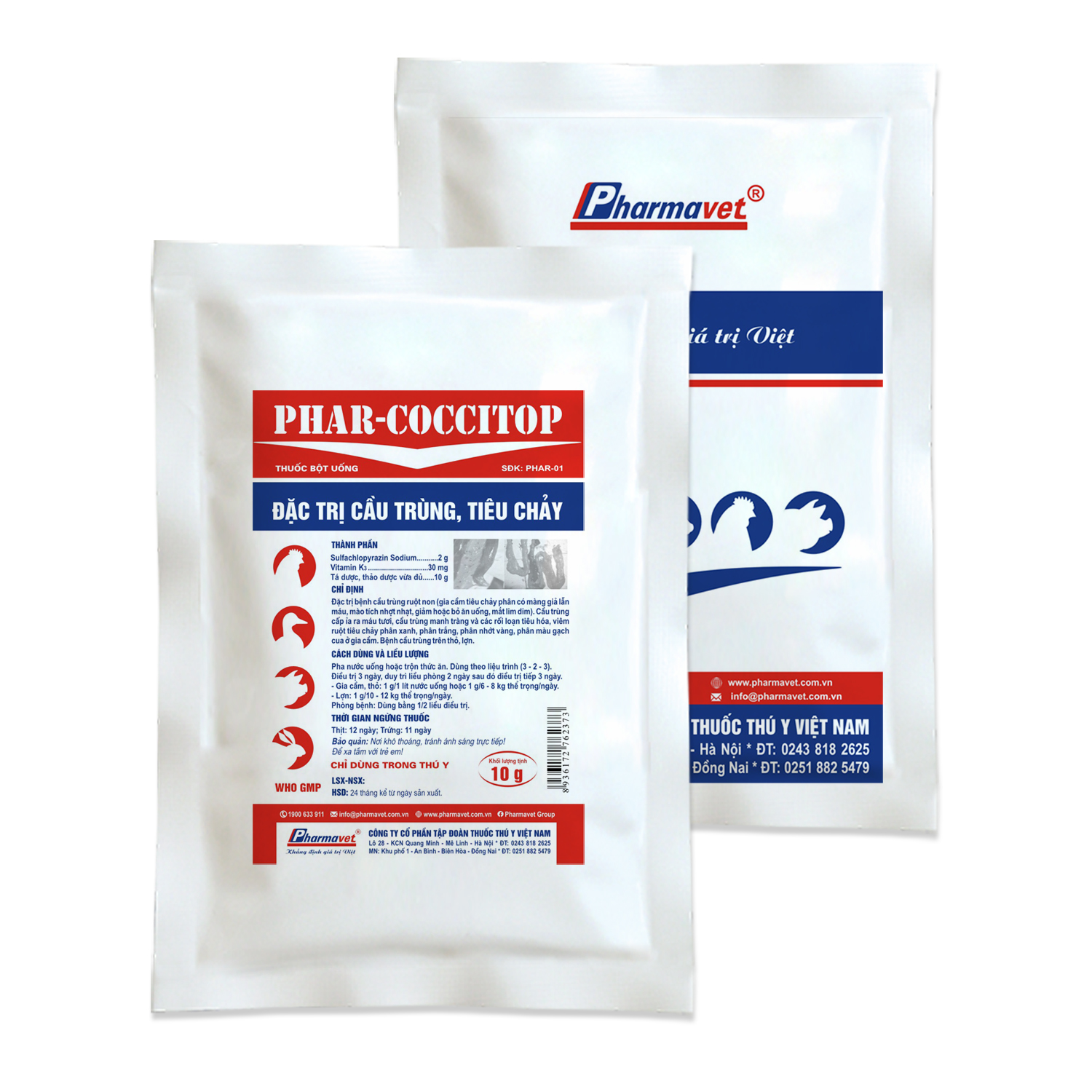 Đặc trị bệnh cầu trùng ruột non (gia cầm tiêu chảy phân có màng giả lẫn máu, mào tích nhợt nhạt, giảm hoặc bỏ ăn uống, mắt lim dim). Cầu trùng cấp ỉa ra máu tươi , cầu trùng manh tràng và các rối loạn tiêu hóa, viêm ruột tiêu chảy phân xanh, phân trắng, phân nhớt vàng, phân màu gạch cua ở gia cầm. Bệnh cầu trùng trên thỏ lợn.