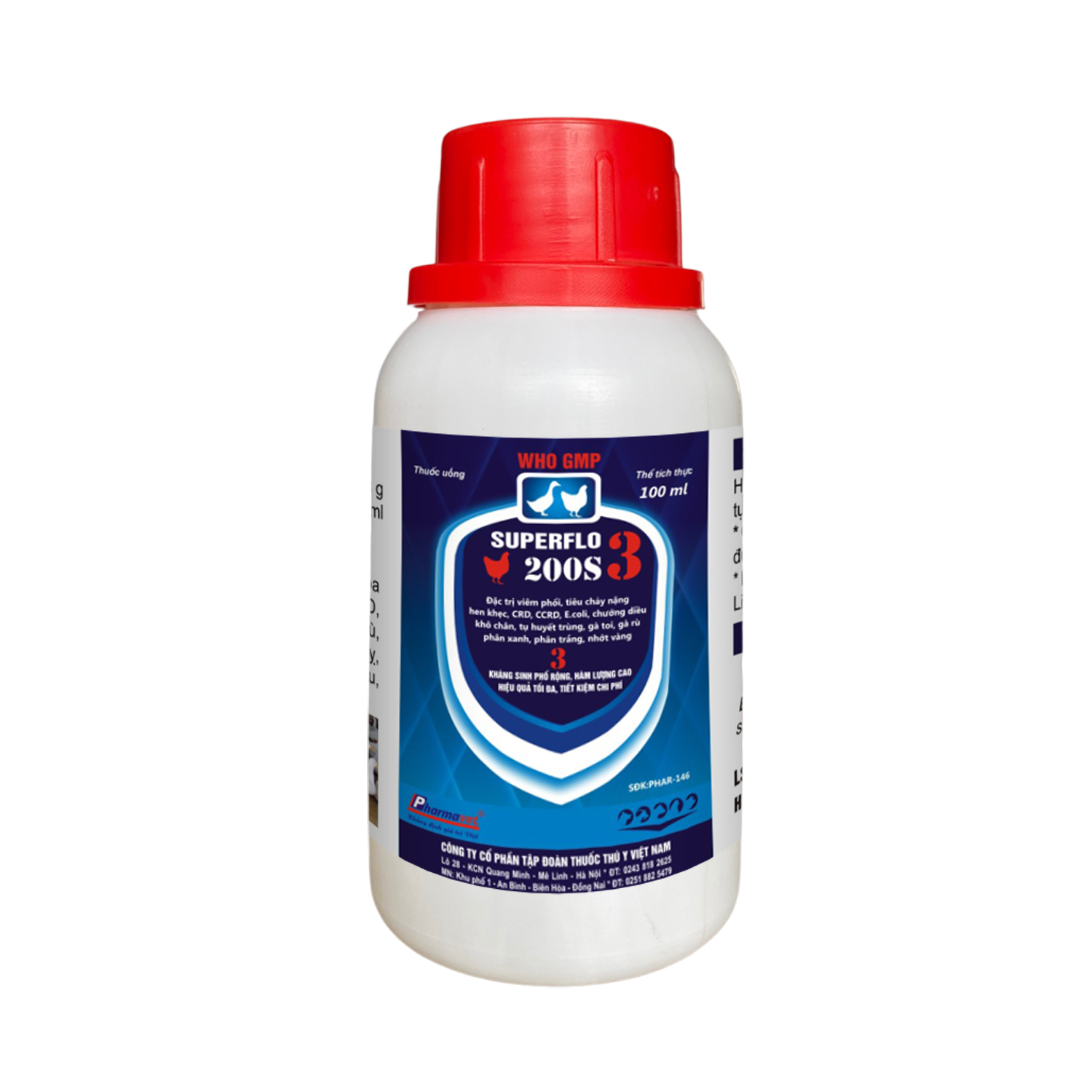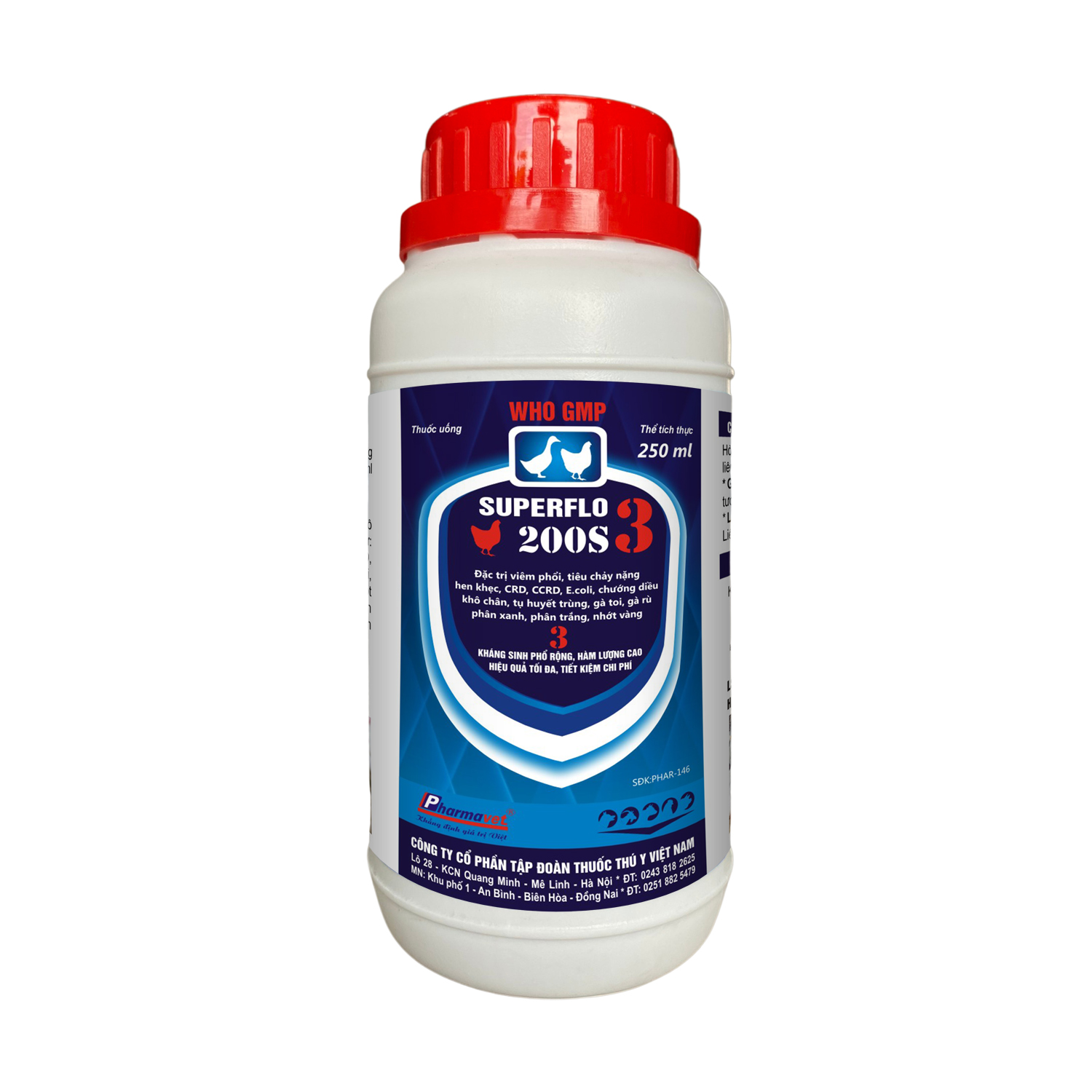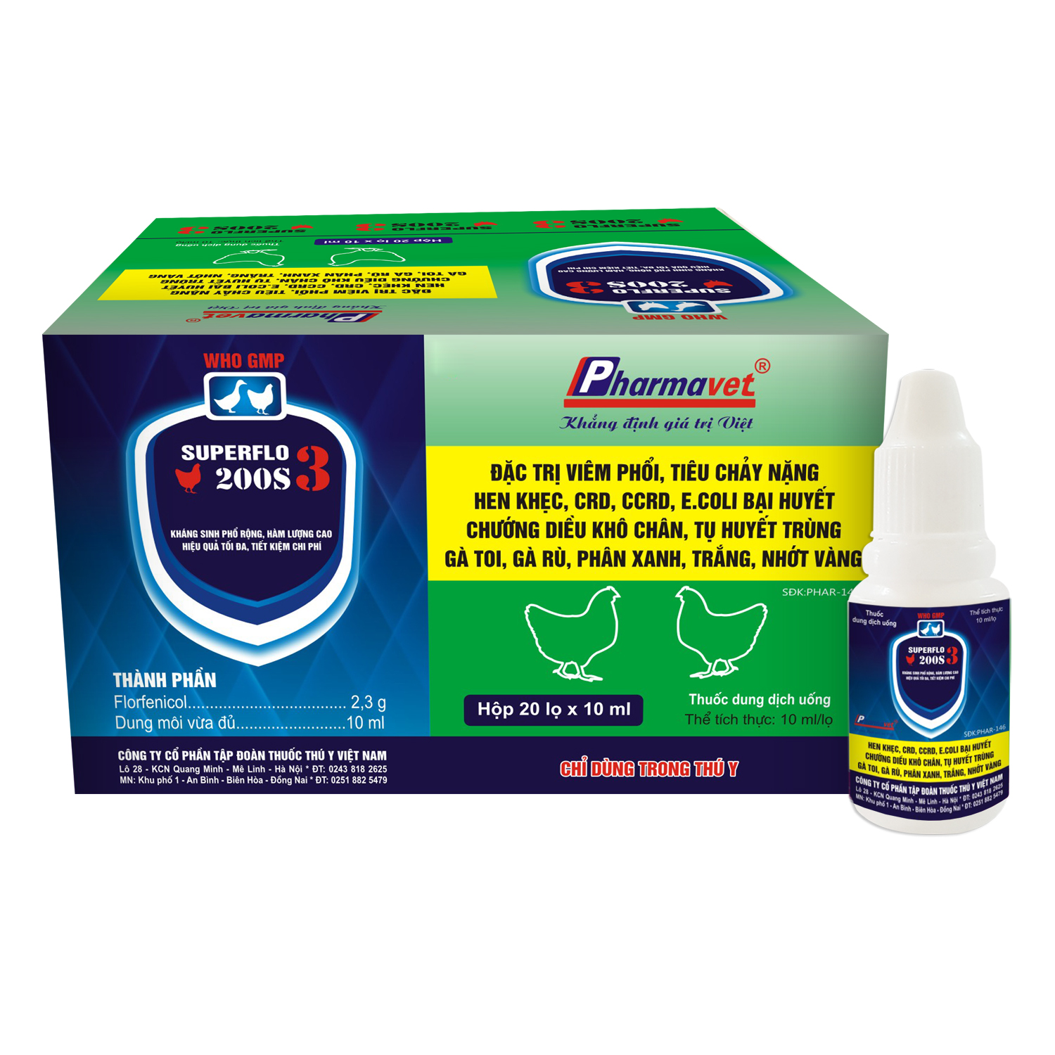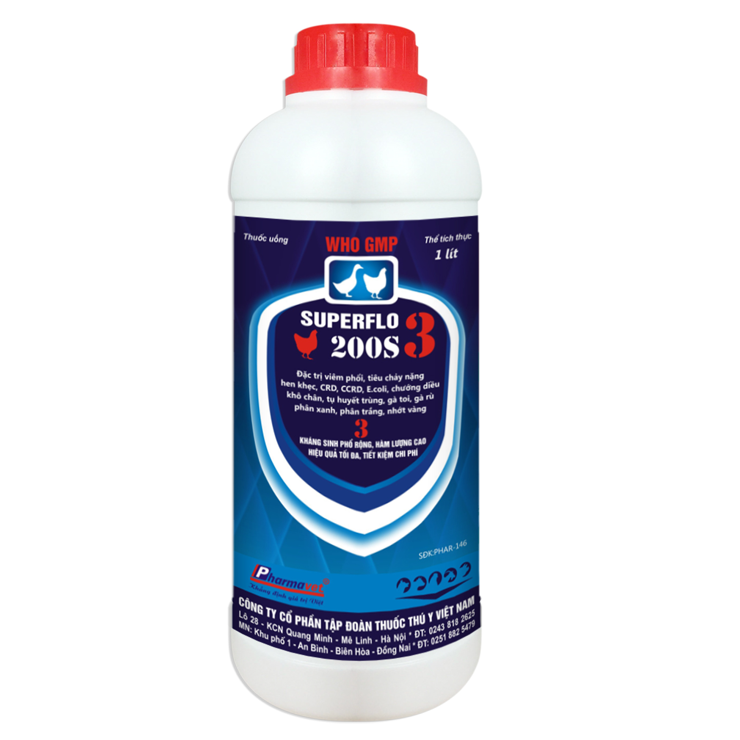 Đặc trị các bệnh nhiễm khuẩn đường hô hấp, tiêu hóa nặng ở gia cầm, lợn như: Viêm phổi, hen khẹc, CRD, CCRD, E.coli kéo màng, tụ huyết trùng, gà toi, gà rù, chướng diều khô chân, viêm ruột tiêu chảy, bạch lỵ, thương hàn, phân xanh, phân trắng, sưng phù đầu, nhiễm trùng huyết.