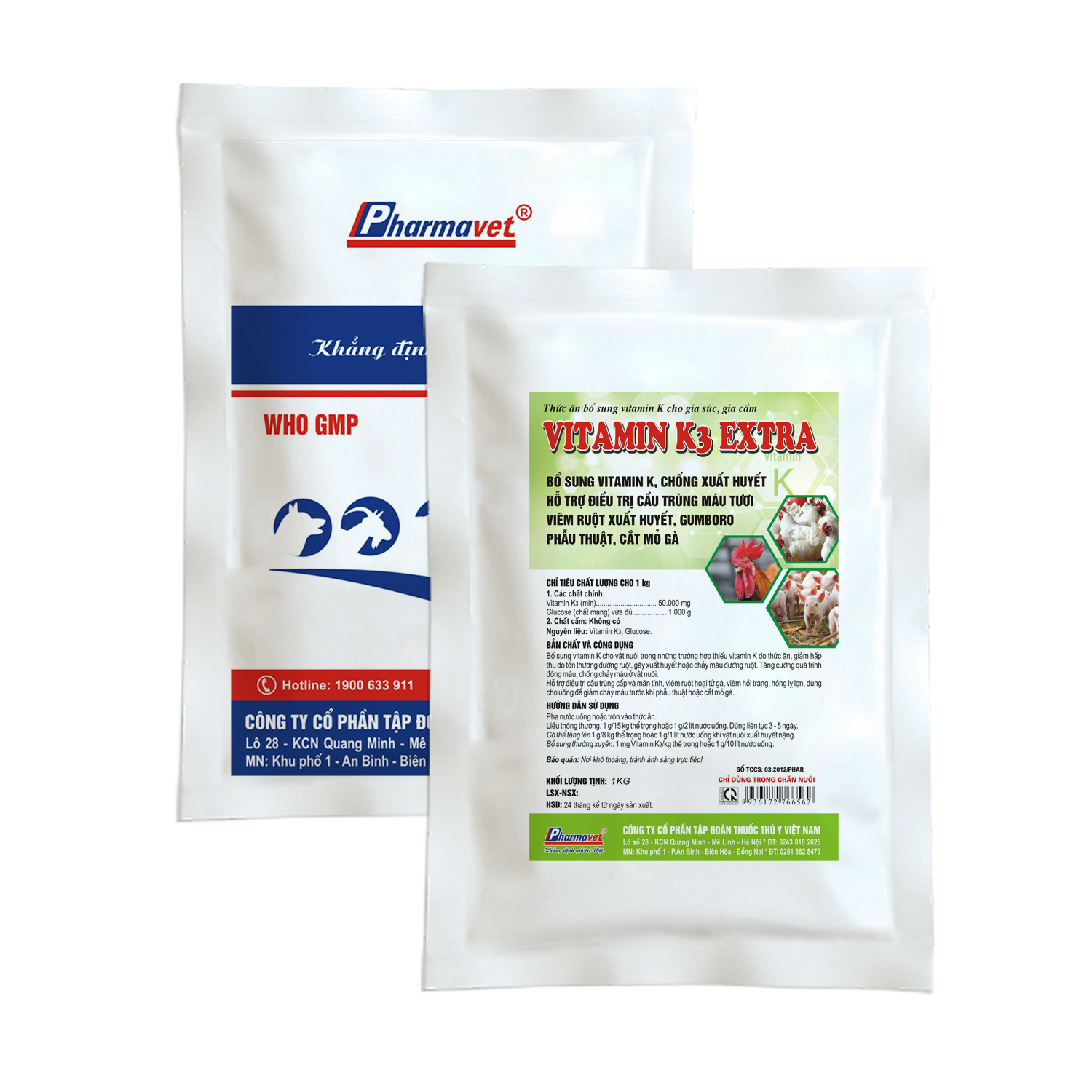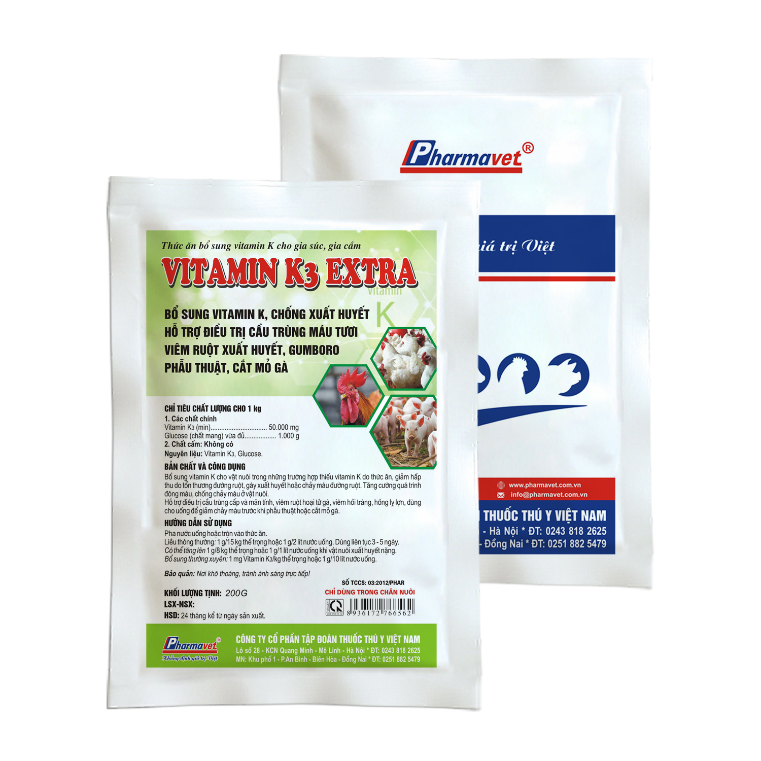 Bổ sung vitamin K cho vật nuôi trong những trường hợp thiếu vitamin K do thức ăn, giảm hấp thu do tổn thương đường ruột, gây xuất huyết hoặc chảy máu đường ruột. Tăng cường quá trình đông máu, chống chảy máu ở vật nuôi. Hỗ trợ điều trị cầu trùng cấp và man tính, viêm ruột hoại tử gà, viêm hồi tràng, hồng lỵ lợn, dùng cho uống để giảm chảy máu trước khi phẫu thuật hoặc cắt mỏ gà.